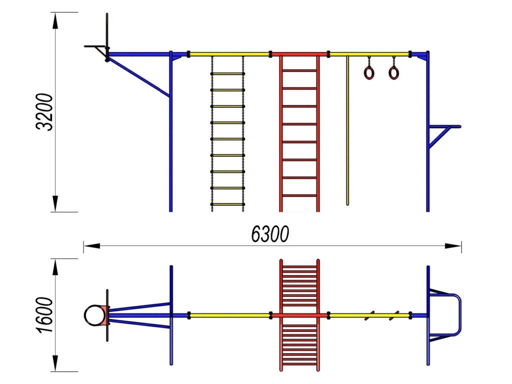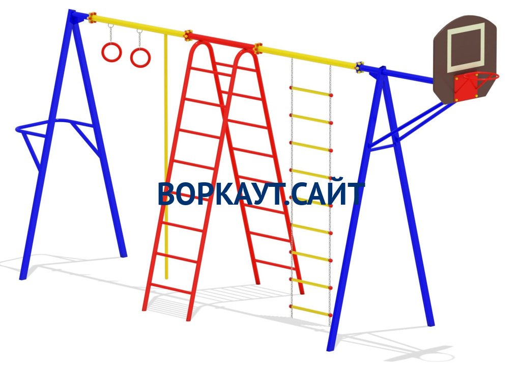 Гимнастический комплекс состоит из стойки с баскетбольным щитом, лестницы гибкой, лестницы, каната, гимнастических колец, стойки со спортивным снарядом