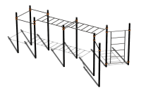 Большая конструкция для эффективных тренировок на улице. Представленный проект спортивного комплекса включает в себя все необходимые элементы, а именно: разноуровневые турники, два рукохода и шведскую стенку. Выполнение упражнений позволяет включить в работу все группы мышц. Конструкция выполнена из металла, все элементы соединяются между собой болтами и гайками. Сборно-разборный тип, поэтому доставляется на объект отдельными элементами и там собирается.